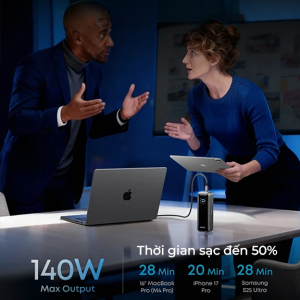 Sản phẩm nổi bật với khả năng sạc nhanh lên đến 140W qua cổng USB-C, hỗ trợ nạp lại nhanh 100W và có thể quản lý thông minh thông qua ứng dụng. Thiết kế nhỏ gọn giúp dễ mang theo khi làm việc hoặc di chuyển.